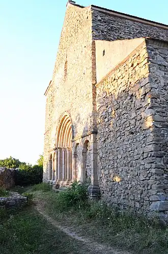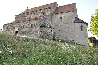 Spre sfârșitul secolului al XII-lea începe să se ridice o biserică romanică scurtă, cu trei nave, corp pătrat, absidă semicirculară, absidiole în partea de est a navelor laterale și cu două turnuri proiectate în partea de vest a colateralelor, care n-au mai fost realizate decât parțial. Acest edificiu se află situat pe vârful stâncos al dealului, deal care prezintă un platou foarte îngust în partea superioară a lui. Edificiul religios este unul din cele mai reprezentative și mai vechi monumente romanice din Transilvania.
