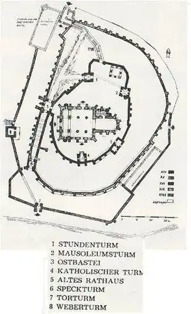 ![]() Biserica fortificată din Biertan ![]() Machetă pentru biserica fortificată din Biertan ![]() Planul fortificaţiei din Biertan[2] | |