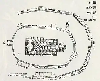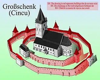 ![]() Biserica fortificată din Cincu ![]() Machetă - Reconstituire pentru biserica din Cincu ![]() Planul fortificaţiei din Cincu[2] | |