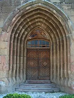 În luneta acestuia este pictat pe un fond albastru-cobalt un simbol al sacrificiului, pelicanul care își hrănește puii cu propria carne. De o parte și de alta a portalului se detașează, atât la interior, cât și la exterior, două turnulețe sub formă de sacnasiu, care adăpostesc scările în spirală ce duc la tribune. În secolul al XV-lea comunitatea a avut o tentativă de a transforma bazilica în stil gotic, însă lucrările nu au continuat dincolo de supraetajarea turnului-clopotniță, care cu cei 32 de metri ai săi devenea cel mai înalt din Țara Bârsei. La parter, turnul-clopotniță se prezintă ca un portic boltit în cruce cu nervuri groase cu profil tipic cistercian. Nivelul al treilea are trei nișe cu metereze, ca și următorul, clopotele aflându-se la nivelul al cincilea. Nivelurile superioare au fost adăugate două secole mai târziu și sunt construite din tuf calcaros. Drumul de strajă a rezistat până în secolul al XVIII-lea. Un element interesant îl constituie orologiul cu un singur arătător, care indică orele și care datează din secolul al XVI-lea. Turnulețele de la colțurile acoperișului semnificau, ca și în cazul altor biserici, autoritatea de ius gladii pe care o avea Hărmanul. Pitorescul exteriorului bisericii îl constituie cămările de provizii ridicate deasupra colateralelor și scările lor mobile.[1]