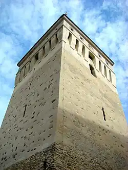 Turnul de nord, care în anul 1677 a fost prevăzut cu o fleşă marcantă, asemănătoare cu cea a turnului cu ceas din Sighişoara.jpg)