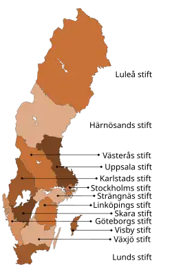 Biserica Suedeză este împărțită în 13 dieceze (episcopii):