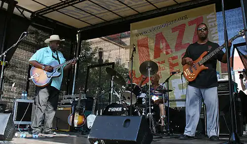 | Instrumente tipice | Chitară, chitară bas, pian, harmonică, upright bass, baterie, saxofon, vocal, trompetă, cornet, trombon |