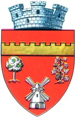 Prin decretul regal din 20 septembrie 1932 a fost aprobată stema cu următoarea descrierii: „scut roșu, având la dreapta un pom dezrădăcinat, cu trei fructe verzi, la stânga o viță-de-vie cu struguri și frunze, toate de argint, pe un arac negru; in vârf o moară de vânt de argint, sus o fascie crenelată de aur. Scutul timbrat cu o coroană murală de argint cu trei turnuri. Simbolizează bogăția orașului în grădini și vii și valul roman ce trece în apropierea lui”.[11]