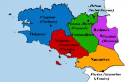 - Venetii, care erau localizați în actualul departament Morbihan și erau înrudiți cu poporul din Gwynedd (Țara Galilor). Ei au dat numele orașului Vannes (Gwened în bretonă).
