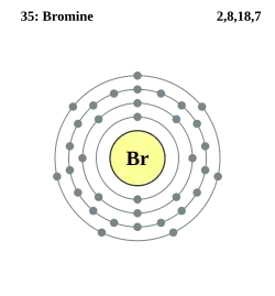 Pe baza așezării sale în sistemul periodic, despre brom se pot trage concluziile: datorită faptului că bromul se află în grupa a VII-a principală, rezultă atunci că acesta are 7 electroni pe stratul de valență (ultimul strat electronic); bromul, aflându-se în perioada a 4-a, are în total patru straturi electronice, dintre care trei sunt ocupate complet cu electroni.[14]