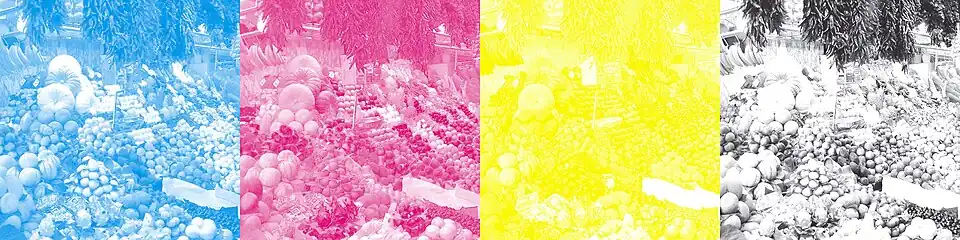 O imagine color este separată în cele patru culori C, M, Y, K (vezi imaginile de mai sus). Imprimarea se face în 4 etape, care corespund celor patru culori. Straturile de culoare au o anumită concentrație tradusă prin tonurile de culoare proprii imaginii care trebuie tipărită.