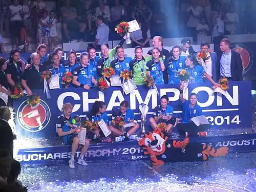 Pe plan european, CSM București și-a făcut debutul în Liga Campionilor EHF într-o grupă preliminară alături de Budućnost, IK Sävehof și MKS Selgros Lublin.[42] Victorii tur-retur împotriva echipelor din Suedia și Polonia, dar și un egal înregistrat în compania echipei muntenegrene, i-au adus clubului locul doi în această grupă.[43] În următoarea fază a competiției, pe fondul unor accidentări,[44] dar și a unei instabilități financiare,[45] CSM a suferit înfrângeri împotriva echipelor de tradiție Győri Audi ETO KC și ŽRK Vardar. Totuși, „tigroaicele” au acumulat suficiente puncte pentru a se califica în sferturile de finală ale competiției,[46] unde au învins de două ori echipa Rostov Don (25-26 și 28-29), care fusese neînvinsă în acest sezon de Champions League și era considerată drept una dintre marile favorite la titlu.[47] Ajunsă în Final four-ul Ligii Campionilor, desfășurat la Budapesta pe 7 și 8 mai 2016, echipa CSM București învinge categoric în semifinale ŽRK Vardar, scor 27-21, și se califică în premieră în marea finală a competiției.[48] La finalul unui meci extrem de disputat împotriva clubului Győr (26-29), al cărui deznodământ a venit după două reprize de prelungiri și lovituri de la 7 metri, Mica Brădeanu a marcat golul victoriei.[49] În această finală, suedeza Isabelle Gulldén a avut un aport considerabil, marcând 15 dintre golurile formației bucureștene.[50] Ea avea să devină și golghetera competiției, iar portarul croat Jelena Grubišić a fost desemnat MVP-ul Final four-ului.[51] Prin câștigarea acestui trofeu, CSM București a readus titlul de campioană a Europei în România după o pauză de 52 de ani, ultima victorie datând din 1964 (prin Rapid București).[52]