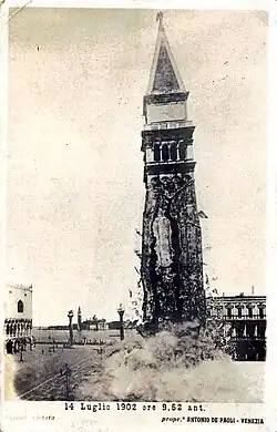 În iulie 1902, zidul de nord al turnului a început să prezinte semne ale unei crăpături periculoase care a continuat să crească în următoarele zile. În cele din urmă, luni, 14 iulie, în jurul orei 09:45, campanila s-a prăbușit complet, distrugând de asemenea logetta. Din fericire, nimeni nu a fost ucis, cu excepția pisicii îngrijitorului.[7] Din cauza poziției campanilei, prejudiciul rezultat a fost relativ limitat. În afară de logetta, doar un colț al Bibliotecii Marciane a fost distrus. Pietra del bando, o coloană de porfir mare de pe care se citeau legile, a protejat bazilica.