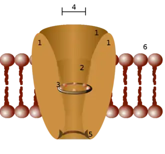 Diagramă schematică a unui canal ionic. 1 - domeniul proteic (de obicei, 4 pentru fiecare canal), 2 - vestibul exterior, 3 - filtru de selectvitate, 4 - diametrul filtrului, 5 - situs de fosforilare, 6 - membrană celulară.