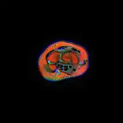 Loja medială (canalul radiocarpian) este cu mult mai mare decât cea laterală, conține: nervul median (Nervus medianus), tecile sinoviale pentru tendoanele mușchilor flexori ai degetelor (cu excepția tendonului flexorului ulnar al carpului): teaca sinovială comună (Vagina communis tendinum musculorum flexorum manus) a mușchiului flexor superficial al degetelor (Musculus flexor digitorum superficialis) și mușchiului flexor profund al degetelor (Musculus flexor digitorum profundus) și teaca sinovială a tendonului mușchiului flexor lung al policelui (Vagina tendinis musculi flexoris pollicis longi).