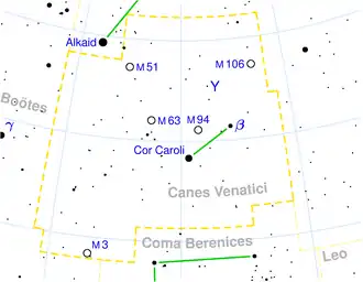 | Cea mai strălucitoare | α2 CVn (Cor Caroli) (2,89m) |