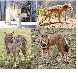 | Sus: lupul cenușiu (Canis lupus) și coiotul (Canis latrans). Jos șacalul auriu (Canis aureus) și lupul abisinian (Canis simensis) | |