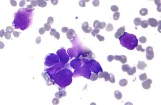 ![]() Micrograf al unui carcinom pulmonar primar mic, un tip de carcinom. Celulele canceroase grupate constau în principal din nucleu (purpuriu); ele au doar o margine limpede de citoplasmă. Înconjurate de un înveliș pal, celulele discoide sunt eritrocite. Specimen citopatologic. | |