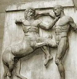 Centaurii sunt un popor legendar din Tesalia, jumătate oameni, jumătate animale, cu trup de cal și bust de oameni.[1][2] Comportarea lor la nunta lui Piritou, regele lapiților, la care au fost invitați, este un episod memorabil din mitologia greacă: ei au pus atunci stăpânire pe tânăra soție și pe ceilalți invitați, și au provocat astfel unele înfruntări pe viață și pe moarte. Au fost învinși însă de lapiți, ajutați de Tezeu, și izgoniți pentru totdeauna din Tesalia (lupta aceasta este cunoscută cu numele de centauromachie). Au mai fost învinși altă dată de Heracles. Sunt demne de a fi reținute numele a doi centauri: Chiron și Nessus. Centaurii întruchipează forța umană și animală, unită într-o singură creatură.