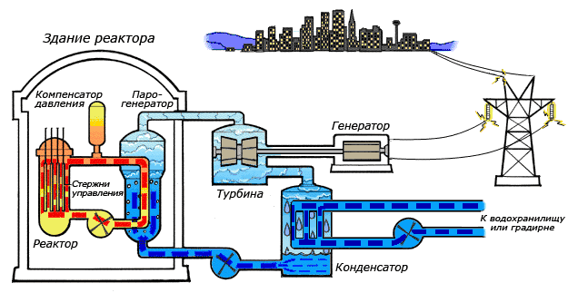 Figura arată funcționarea unei centrale nucleare cu un reactor de putere răcit cu apă dublu-circuit. Energia eliberată în miezul reactorului este transferată la agentul de răcire primar. Apoi, lichidul de răcire pătrunde în schimbătorul de căldură (generatorul de abur), unde încălzește apele celui de-al doilea circuit la fierbere. Aburul rezultat intră în turbină, prin rotirea generatoarelor electrice. La ieșirea din turbine, aburul intră în condensator, unde este răcit de o cantitate mare de apă care vine din rezervor.