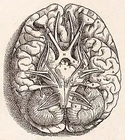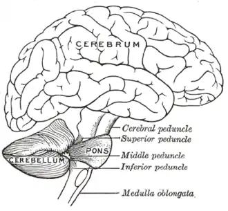 ![]() Desen al creierului uman, înfățișând cerebelul și puntea | |