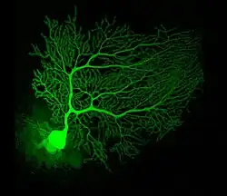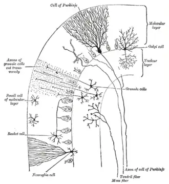 Celulele Purkinje sunt printre cei mai distinctivi neuroni din creier și unul dintre tipurile identificate cel mai timpuriu. Acestea au fost descrise pentru prima oară de anatomistul ceh Jan Evangelista Purkyně în 1837. Sunt recunoscute după forma arborizațiilor lor dendritice care se ramifică substanțial, însă sunt deosebit de aplatizate într-un plan perpendicular pe foliile cerebeloase. Așadar, dendritele unei celule Purkinje creează o rețea planară densă, prin care trec fibrele paralele, la unghiuri drepte.[8] Dendritele prezintă spine dendritice, fiecare dintre acestea sinapsând cu o fibră paralelă aferentă. Celulele Purkinje recepționează mai multe aferențe decât oricare alt tip de celulă din creier—estimările asupra numărului de spine conținute de o singură celulă Purkinje umană ajung chiar și la 200.000.[8] Corpurile celulare mari și sferice ale celulelor Purkinje sunt distribuite într-un strat îngust (gros de o celulă) a cortexului cerebelos, numit stratul Purkinje sau ganglionar. După trimiterea de colaterale ce afectează alte părți învecinate ale cortexului, axonii lor ajung adânc în nucleii intracerebeloși, unde fiecare realizează circa 1.000 de conexiuni cu mai multe tipuri de celule nucleare, toate într-un spațiu restrâns. Celulele Purkinje utilizează GABA ca neurotransmițător, exercitând în consecință efecte inhibitorii asupra neuronilor cu care sinapsează.[8]
