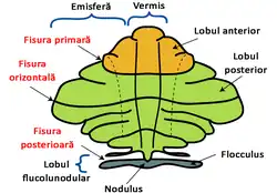 Prin raportare la aspectul suprafeței sale, trei lobi pot fi recunoscuți în cerebel: lobul anterior (deasupra fisurii primare), lobul posterior (sub fisura primară) și lobul floculonodular (sub fisura posterioară). Acești lobi divid cerebelul din partea sa rostrală spre cea caudală (la oameni, de sus în jos). Funcțional vorbind, însă, există o distincție mult mai importantă între zonele mediale și laterale. Lăsând deoparte lobul floculonodular, care are conexiuni și funcții distincte, cerebelul poate fi divizat funcțional într-un sector medial numit spinocerebel și unul lateral, mai mare, numit cerebrocerebel.[10] O fâșie îngustă de țesut proeminent de-a lungul liniei mediane se numește vermis cerebelos (vermis înseamnă, în latină, „vierme”).[10]