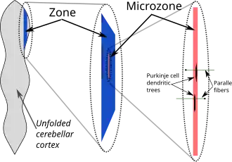La finele anilor 1970, Oscarsson a propus ca aceste zone corticale să fie divizate în unități mai mici, numite microzone.[25] O microzonă e definită ca fiind un grup de celule Purkinje care au toate același câmp receptor somatotopic. S-a descoperit că microzonele conțin cam 1000 de celule Purkinje fiecare, aranjate într-o fâșie lungă și îngustă, orientată perpendicular pe pliurile corticale.[23] Astfel, așa cum ilustrează și diagrama alăturată, dendritele celulelor Purkinje sunt aplatizate în aceeași direcție în care se extind și microzonele, în timp ce fibrele paralele le traversează în unghi drept.[8]