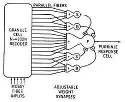 Aproape toate teoriile de „învățare” derivă din publicațiile lui Marr și Albus. Articolul din 1969 a lui Marr propunea că cerebelul este un aparat pentru a învăța cum să se asocieze mișcările elementare codificate de fibrele cățărătoare cu aferențele de la fibrele mușchiforme care codifică contextul senzorial.[22] Albus a propus în 1971 că o celulă cerebeloasă Purkinje funcționează ca un perceptron, un mecanism de învățare abstract inspirat neuronal.[5] Diferența de bază dintre teoriile lui Marr și Albus este că Marr a presupus că activitatea fibrelor cățărătoare ar cauza sinapsele fibrelor paralele să fie întărite, pe când Albus a propus că acestea ar fi slăbite. Albus și-a formulat, de-asemenea, versiunea ca un algoritm software pe care l-a numit CMAC (Cerebellar Model Articulation Controller), care a fost testat în cadrul mai multor aplicații.[46]