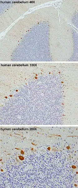 - ↑ Whitney ER, Kemper TL, Rosene DL, Bauman ML, Blatt GJ (februarie 2008). „Calbindin-D28k is a more reliable marker of human Purkinje cells than standard Nissl stains: a stereological experiment”. Journal of Neuroscience Methods. 168 (1): 42–7. doi:10.1016/j.jneumeth.2007.09.009. PMID 17961663.