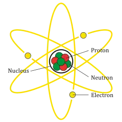 Atomul este cea mai mică particulă dintr-o substanță care prin procedee chimice obișnuite nu poate fi divizată în alte particule mai simple, fiind unitatea structurală a chimiei[73]. Este o grupare a materiei care constă într-un miez dens numit nucleu atomic, înconjurat de un spațiu numit nor electronic. Nucleul este alcătuit din particule încărcate pozitiv numite protoni și neutroni (împreună sunt numiți nucleoni), în jurul căruia orbitează particulele încărcate negativ din norul electronic (electronii)[73]. Într-un atom neutru, electronii încărcați negativ echilibrează numărul încărcăturii pozitive ale protonilor. Nucleul este dens, masa acestuia fiind de 1836 de ori mai mare decât a electronului, cu toate că raza atomului este de 10.000 de ori mai mare decât a nucleului său.[74][75]
