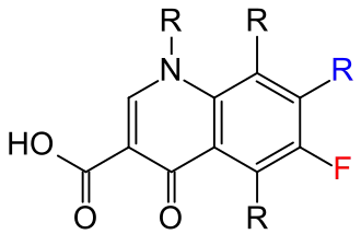 ![]() Structura generală a unui derivat fluorochinolinic: cu roșu este atomul de fluor din poziția 6, iar R sunt resturi alchilice (piperazil, ciclopropil, etc.) | |