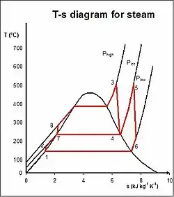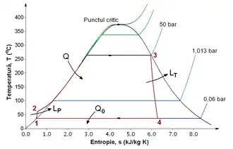 Randamentul ciclului Carnot lucrând între aceste temperaturi (374 °C / 30 °C) este de cca. 53 %. Comparând diagramele T-s ale unui ciclu Carnot și a ciclului Rankine este evident că, deoarece pentru cicluri lucrând între aceleași temperaturi și entropii suprafața corespunzătoare lucrului mecanic ciclic produs de ciclul Rankine este mai mică decât cea din ciclul Carnot, randamentul ciclului Rankine este mai mic decât al ciclului Carnot.[10][11][12]