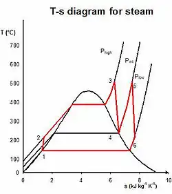 Într-un ciclu Clausius-Rankine ideal transformările din pompă și turbină sunt izentropice, adică pompa și turbina nu generează entropie, deci randamentul lor este maxim. În acest caz transformările 1-2 și 3-4 apar în diagrama T-s ca linii verticale și ea seamănă foarte bine cu ciclul Carnot. Ciclul prezentat aici, nefolosind abur supraîncălzit reduce cantitatea de căldură evacuată prin condensator, însă, datorită temperaturii maxime scăzute (temperatura de fierbere) randamentul însuși al ciclului Carnot lucrând între aceste temperaturi este scăzut.