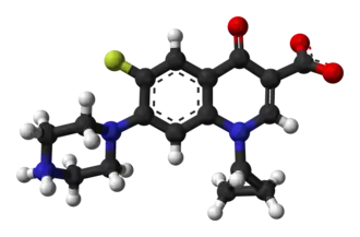 Ciprofloxacina este un antibiotic din clasa fluorochinolonelor utilizat în tratamentul unui număr mare de infecții bacteriene.[9] Printre acestea se numără artritele infecțioase, infecțiile intra-abdominale, diareea infecțioasă, infecții ale sistemului respirator, infecții cutanate, febră tifoidă și infecții genito-urinare.[9] Metodele de administrare sunt oral, intravenos sau sub formă de picături oftalmice.[9][10]