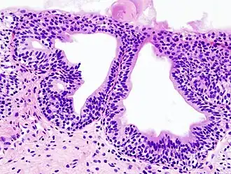 ![]() Analiza histopatologică a unei cistite granulare, în urma unei biopsii. Colorație cu hematoxilină și eozină. | |