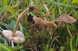 Coprinellus micaceus sin. Coprinus micaceus | Burete de mică, balegă strălucitoare, bureți de rouă | Toxicitate: destul de otrăvitor, reacții asemănătoare cu curele de dezalcoolizare). Fără alcool tânăr comestibil.[112] | ![]() | Coprinopsis atramentaria sin. Coprinus atramentarius | Burete de cerneală, bureți nebuni, ciuperci crestate, poplence, umbra șarpelui etc. | Toxicitate: destul de otrăvitor, reacții asemănătoare cu curele de dezalcoolizare). Fără alcool delicios în stadiu tânăr.[113] | ![]() | Toxicitate: Letal! Este ușor de confundat cu Kuehneromyces mutabilis.[114] | ||||
