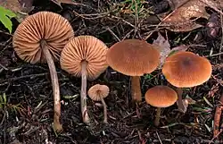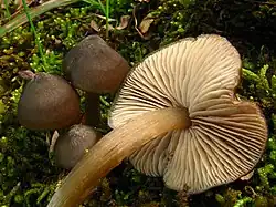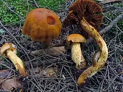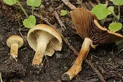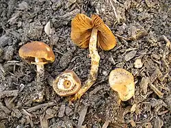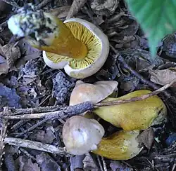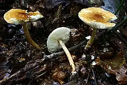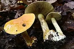 ![]() | Cortinarius croceus | Necunoscută. | Toxicitate gastrointestinală destul de gravă.[28] | Cortinarius elegantissimus | Necunoscută. | Toxicitate gastrointestinală posibilă. Miros și gust plăcut.[29] | Cortinarius flexipes | Necunoscută. | Toxicitate gastrointestinală posibilă. Miros dulceag cu o nuanță de marțipan (migdale amare) sau ca de patiserie și gust neplăcut.[30] | |||