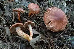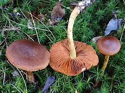 ![]() | Cortinarius bolaris | Necunoscută. | Toxicitate: foarte gravă. Substanța nu este orelanina. Miros și gust neplăcut.[21] | ![]() | Cortinarius brunneus | Necunoscută. | Toxicitate: posibil foarte gravă. Substanța nu este orelanina. Miros și gust neplăcut.[22][23] | Cortinarius callisteus | Necunoscută. | Toxicitate: foarte gravă. Substanța nu este orelanina. Miros neplăcut ca de ulei pentru mașină fierbinte, uneori asemănător marțipanului cu o notă mucegăită, gust blând și dulcișor.[24] | ||