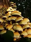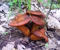 ![]() | Hypholoma fasciculare | Ghebă pucioasă | Toxicitate: Destul de grav gastrointestinal.[118] | ![]() | Hypholoma lateritium sin. Hypholoma sublateritium | Ghebă cărămizie | Toxicitate: provoacă hemoliză și aglutinină.[119] | Omphalotus olearius sin. Pleurotus olearius, Clitocybe olearia | Buricul măslinului | Toxicitate: Grav gastrointestinal. Substanța toxică este illudina. Aceasta duce la greață și vărsături.[120] | ||
