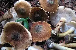 ![]() | Inocybe geophylla | Ciuperci cu lame de pământ | Toxicitate: otrăvitoare. Conține muscarină în doze mari.[57] | Inocybe hirtella | Necunoscută. | Toxicitate: foarte otrăvitoare, poate chiar letală. Miros de alune amare sau marțipan și gust blând, conține destul de multă muscarină.[58] | Inocybe lacera | Necunoscută. | Toxicitate: posibil letală. Miros și gust neplăcut, conține un derivat al muscarinei în doze mari.[59] | |||