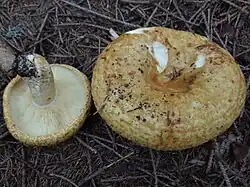 ![]() | Lactarius helvus | Lăptar gri-roz | Toxicitate: otrăvitor (gastrointestinal), dar uscat și pulverizat ca condiment comestibil.[102] | ![]() | Lactarius pubescens | Râșcov bărbos, lăcustă albă | Toxicitate medie.[103] | ![]() | Lactarius scrobiculatus | Necunoscută. | Toxicitate medie: provoacă sindromul resinoidian.[104] | |