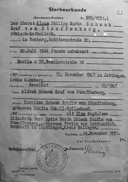 Claus Philipp Maria Justinian Schenk Graf von Stauffenberg (n. 15 noiembrie 1907, Jettingen-Scheppach, Bavaria – d. 21 iulie 1944, Berlin) a fost un ofițer german, de origine aristocrată [10], care în timpul celui de al Doilea Război Mondial a participat la organizarea și executarea atentatului eșuat din 20 iulie 1944 ce viza eliminarea dictatorului Germaniei Naziste, Adolf Hitler. La început el a fost un simpatizant al regimului autoritar nazist, ulterior, când și-a dat seama de metodele criminale ale naziștilor, va trece în fruntea rezistenței germane, fiind unul dintre personalitățile principale care participă la atentatul din 20 iulie 1944 împotriva lui Hitler. Participarea lui Stauffenberg a fost esențială, deoarece în calitate de membru al statului major al Armatei de Rezervă acesta a putut avea acces la sala de raport a lui Hitler, situată în adăpostul lupului, putând astfel plasa dispozitivul explozibil. Atentatul împotriva lui Hitler a eșuat, Stauffenberg a fost executat a doua zi după atentat.
