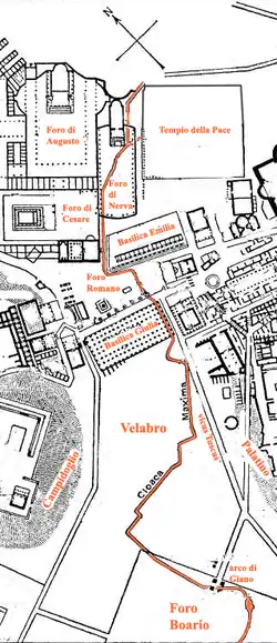 - o ramură care venea din direcția arcului lui Septimiu Sever, în lungul Forului Roman.