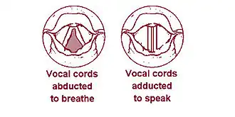 În timpul respirației coardele vocale sunt depărtate. În timpul fonației, asupra cartilajelor aritenoide acționează mușchii cricotiroidieni, aritenoidieni și cricoaritenoidieni laterali și posteriori. Prin modificarea poziției cartilajelor aritenoide coardele vocale pot fi astfel ridicate, coborâte, apropiate, depărtate, întinse sau destinse. Vibrațiile coardelor vocale sunt produse de acțiunea aerului expirat asupra marginilor lor și modulate de acțiunea mușchilor, prin gradele diferite de întindere. Amplitudinea și frecvența vibrațiilor depind astfel de factori multipli: viteza aerului, grosimea și textura histologică a coardelor, diametrul laringelui. Vibrațiile sunt mai ample în plan vertical (3-4 mm) decât în cel orizontal (0,2 - 0,5 mm). Aerul este deci expulzat în efluxuri succesive, sincronizate cu momentele de deschidere maximă a orificiului glotic. Se realizează variații ample și bruște ale presiunii aerului, care se transmit în atmosferă și se percep ca sunete. Frecvența determină înălțimea sunetului emis: la bărbați este în jur de 125 Hz, la femei în jur de 210 Hz, iar la copii în jur de 300 Hz.