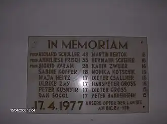 Placa memorială cu numele celor decedaţi în urma avalanşei din 1977