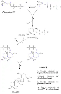 IPP sub acțiunea unei izomeraze se transformă în DMA PP (dimetilalilpirofosfat); prin combinarea acestor izomeri are loc formarea unui alt precursor important în reacțiile biochimice GPP( geranilpirofosfatul cu 10 atomi de carbon în moleculă). GPP reacționează în continuare cu o moleculă de IPP formând farnezil-pirofosfat (C15). 2 molecule de farnesil pirofosfat se condensează cap-cap formând scualenul (C30).