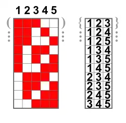 Pot fi enumerate toate cele k-combinări ale unei mulțimi S cu n elemente într-o ordine fixă, care va stabili o relație de bijectivitate între un interval de numere întregi și setul respectivelor k-combinări. Asumând faptul că S este ordonată (de exemplu S={1,2,...,n}), există două posibilități naturale de a ordona cele k-combinari posibile pentru această mulțime: comparând cele mai mici elemente ale lor pentru început (ca în imaginea de mai sus) sau comparând cele mai mari elemente inițial. A doua opțiune are avantajul că a adăuga un nou element cu valoare maximă la S nu va schimba partea inițială a enumerării, ci va pune cele k-combinări noi din mulțimea mai mare după cele precedente. Repetând acest proces, enumerația se poate extinde indefinit cu k-combinări de mulțimi din ce în ce mai mari. Dacă intervalele de numere întregi pornesc de la 0, atunci k-combinarea de pe un loc dat i din enumerație va putea fi calculată ușor din i, iar bijecția astfel obținută va fi cunoscută sub numele de sistem combinatorial de numărare.