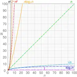 | timp cvasiliniar | O(n log n) | n log n, log n! | Cea mai rapidă sortare prin comparație(d) posibilă; transformata Fourier rapidă(d). | |