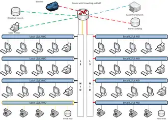 Un LAN este o rețea care acoperă o zonă geografică restrânsă, cum ar fi la domiciliu, birou, sau o clădire. Rețelele LAN curente sunt bazate pe tehnologia Ethernet. De exemplu, o bibliotecă va avea o conexiune prin fir sau de tip Wireless LAN pentru a interconecta dispozitive locale (ex.: imprimante, servere) și pentru a accesa Internetul. Toate calculatoarele din bibliotecă sunt conectate prin fir de rețea de categoria 5, numit UTP CAT5 cable, rulează protocolul IEEE 802.3 printr-un sistem de dispozitive interconectate care eventual se conectează și la Internet. Cablurile care duc spre server sunt de tipul numit UTP CAT5e enhanced cable; ele suportă protocolul IEEE 802.3 la o viteză de 1 Gbit/s. În exemplul din dreapta rețeaua a fost construită în așa fel încât calculatoarele angajaților bibliotecii din partea dreptă a imaginii pot accesa imprimanta color, înregistrările despre cărțile împrumutate, rețeaua academică și Internetul. Toți utilizatorii pot accesa Internetul, și catalogul bibliotecii. Fiecare grup din rețea poate accesa imprimanta sa locală. În rest, imprimantele nu sunt accesibile din afara grupului respectiv. Toate dispozitivele interconectate trebuie să folosească nivelul 3 network layer din modelul de referință OSI, fiindcă în acest exemplu este vorba de mai multe subrețele (cu culori diferite). Subrețelele din interiorul bibliotecii au viteza de numai 10/100 Mbit/s, conexiune Ethernet pînă la utilizatorul final, și Gigabit Ethernet către ruter-ul principal, care poate fi numit și "layer 3 switch", fiindcă el are numai interfață Ethernet și trebuie să "înțeleagă" IP. Mai corect ruterele se numesc: "ruter de acces" (ruterul de sus este un ruter de distribuire care conectează la Internet), și "ruter al rețelei academice" - accesat de utilizator.