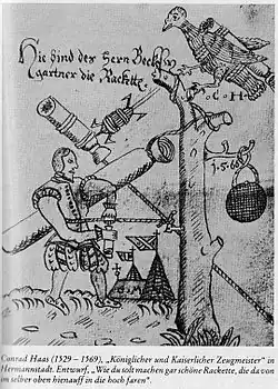Sunt descrise rachete cu pulbere, autopropulsate, care erau considerate de inventatorul lor, fie mijloace de lansare a artificiilor pentru zilele festive, fie arme eficiente de luptă. Rachetele lui fuseseră deja utilizate cu succes împotriva armatelor otomane care în 1542 asediaseră Viena.