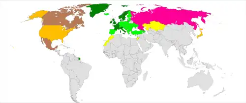 - Belgia, Danemarca, Franța, Grecia, Irlanda, Italia, Luxemburg, Marea Britanie, Norvegia, Olanda, Suedia și Turcia (1949)