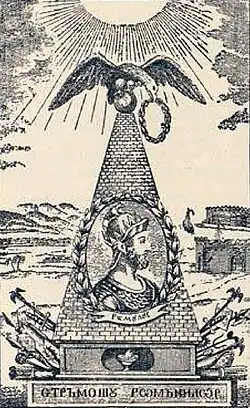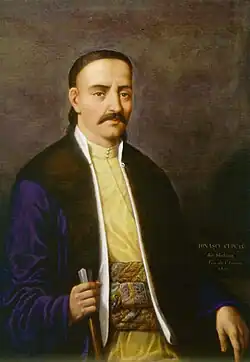 La începuturile noului curent artistic din România, pictura istorică, s-au distins artiști străini precum Henri Mondonville, Anton Chladek, Constantin Daniel Rosenthal, Carol Wallenstein de Vella și Mihail Töpler.[51] Lor li s-au alăturat artiștii români Gheorghe Asachi, Ion Negulici, Barbu Iscovescu, Mișu Popp, Constantin Lecca și alții. Asachi a pus bazele unei clase de zugrăvit la Iași în anul 1813, de unde s-au remarcat Gheorghe Panaiteanu-Bardasare, Teodor Codreanu, Gheorghe Lemeni, Ion Anastasiu și Gheorghe Giușcă. Nicolae Teodorescu și Costache Focșăneanu au învățat pictura la Iași începând din anul 1814. Fiul vornicului Mihalache Manu și Hristache Mladenovici din orașul Craiova au făcut cursuri de artă la Viena în anul 1821.[57] În toată această perioadă premergătoare revoluției din 1848, pictura istorică a reprezentat un curent în plină ascensiune și ca urmare au apărut o mulțime de litografii de figuri domnești și scene istorice. Se poate menționa în acest sens lucrarea lui Grigore Zugravul din 1787 care a înfățișat pe Nicolae Mavrogheni alături de trupele sale și lucrările unui anonim cu scene din răscoala lui Tudor Vladimirescu, în care sunt înfățișați clerici, panduri, țărani și boieri.[58] Gheorghe Asachi a pus să se realizeze o litografie cu portretul lui Ștefan cel Mare, în anul 1810.[59][58][60]