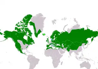 | Arealul corbului comun Reproducere Rezident Non-reproducere | |